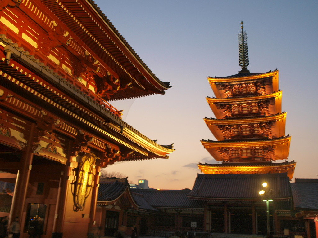 本堂・五重塔・雷門が朱に輝く、和の幻想的な夜景。 - 東京ミズマチ&すみだリバーウォーク